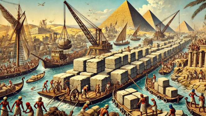 On sait, par exemple, que les Phéniciens et les Egyptiens utilisaient des machines portuaires à force humaine ou animale pour « transborder » du navire au quai, en jouant d’un effet de levier, toutes sortes de marchandises, dépassant parfois plusieurs tonnes – il semble que les pierres des pyramides aient ainsi été chargées et déchargées depuis les bateaux naviguant sur le Nil, comme le montre la reconstitution ci-dessous.