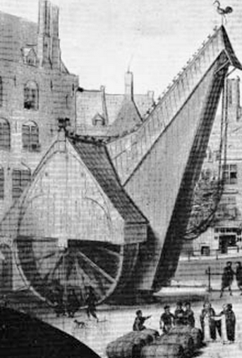 Dans les ports européens du Moyen-Age, il est courant d’utiliser des « grues » (par analogie à l’oiseau migrateur, le terme désignant la machine est repéré dans la langue française pour la première fois en 1467) pour assurer cette fonction ; si leur structure reste en bois, leur fonctionnement se perfectionne notamment par l’usage de la « cage d’écureuil » qui permet de démultiplier la force humaine pour soulever les charges (ci-dessous : reproduction d’une peinture de Brueghel montrant le port de Bruges au XVIe s). Mais ces installations sont complexes et coûteuses ; au début du XVIIe siècle, il n’en existe qu’au plus une soixantaine sur le Vieux continent.
