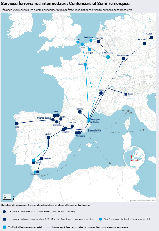 En termes de services réguliers rail-route, tous terminaux et opérateurs confondus, Barcelone est ainsi reliée à 30 destinations différentes (la plupart directes), en Espagne, en France, en Allemagne et en Pologne, par une centaine de trains hebdomadaires, comme le détaille la carte ci-dessous.