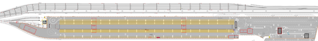 Plan-masse du terminal de La Llagosta ; les zones grisées correspondent aux espaces de circulation routière et ferroviaire, les zones en jaune aux stationnements des UTI (source : Hupac).