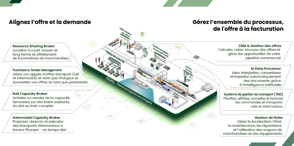 La plateforme modulaire comprend notamment le Rail TMS et l’Intermodal TMS (ITMS), le Purchase & Tender Management (PTM), le Rail Offer Management (ROM), le Fleet Management (RFMS) et l’Intermodal Capacity Broker (ICB), utilisables seuls ou intégrés pour digitaliser la chaîne de bout en bout.